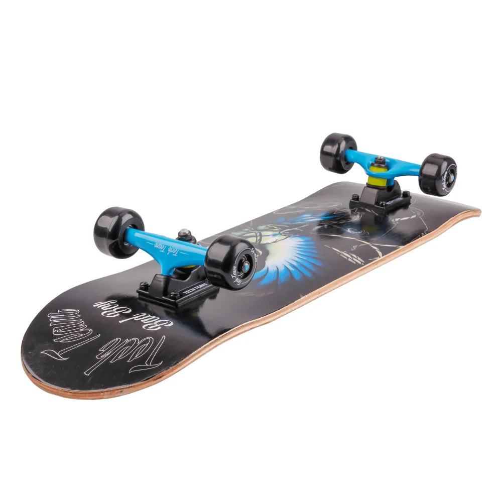 ДЕРЕВЯННЫЙ СКЕЙТБОРД TECHTEAM BAD BOY голубой - из китайского клена голубой по достоинству оценился отечественными пользователями и ездоками СНГ.  Скейтборд выполнен в классическом дизайне. Выглядит эргономично, компактно и надежно. Отличается от других скейтбордов концевым загибом. Уникальная особенность дает возможность качественного выполнения прыжков и маневров. Переживать за поломку и механические дефекты при выполнении трюков не стоит. Гибкость изделия обусловлена особенностями клена.