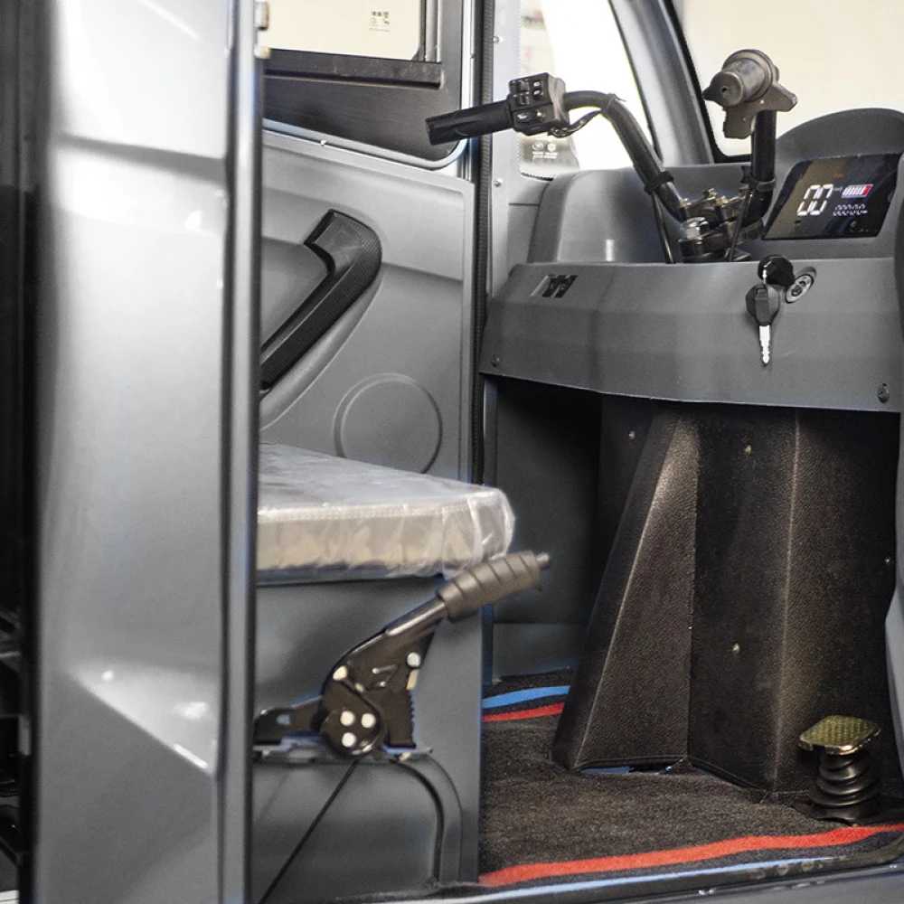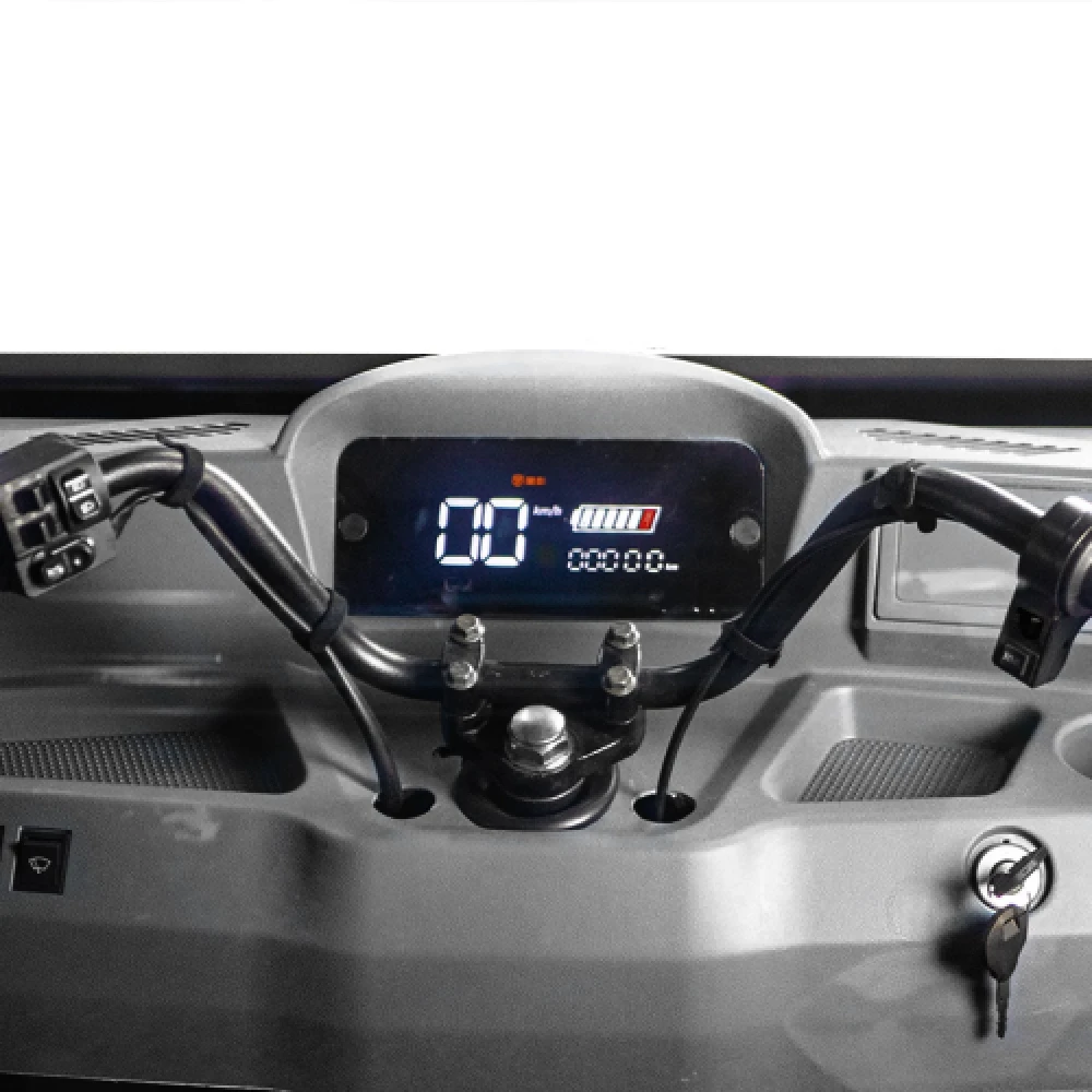 Серый Rutrike КАРГО Кабина 1500 - это надежный партнер для вашего бизнеса. Закрытый кузов защищает водителя от непогоды, позволяя работать в любых условиях. Грузовой отсек размером 1500×1050×330 мм готов принять на борт до 600 кг груза, что делает этот трицикл идеальным для городских перевозок. Мощность 1000 Ватт позволяет преодолевать до 40 км на одном заряде, а максимальная скорость составляет 25 км/ч. Управление осуществляется через мотоциклетный руль, что добавляет маневренности, а задний барабанный тормоз обеспечивает безопасность. Rutrike КАРГО - ваш верный помощник в логистике.